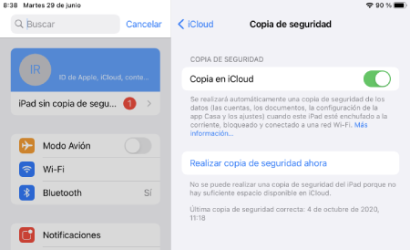 Luego, activaremos Copia en iCloud para que realice automáticamente una copia de seguridad diaria de nuestro dispositivo, siempre y cuando esté conectado a la corriente, bloqueado y conectado a una red wifi (el proceso puede durar bastante dependiendo de la cantidad de archivos que tengamos).