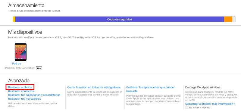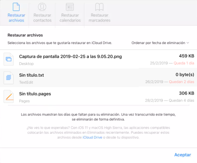 - El servicio en la nube iCloud cuenta con una función para recuperar archivos eliminados: